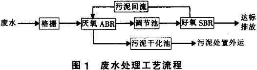 根據廢水的水質波動大、色度高的特點,采用ABR—SBR的組合工藝,流程見圖1。