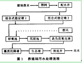 因此,我們選擇新型厭氧一兼氧組合式穩定塘處理工藝,充分利用規模化豬場的地形地勢,妥善地解決了規模化豬場污水污染負荷高和養豬行業的利潤低的兩大難題。此工藝有效地把上流式厭氧污泥床移植到兼性塘來,它具有投資省、運行費低、操作管理方便、能源可回收(目前未回收)的特點。