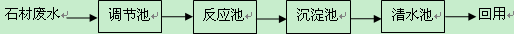石材廢水通過廠區(qū)內(nèi)的管渠收集后,進入調(diào)節(jié)池,以均質(zhì)均量,投加混凝劑和助凝劑后,在反應(yīng)池內(nèi)反應(yīng)生成礬花,通過沉淀池的沉淀,大部分懸浮物沉至池底,上清液進入清水池,通過回用水系統(tǒng)進入生產(chǎn)車間回用或達(dá)標(biāo)排放。