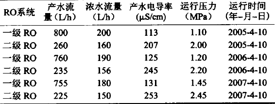 反滲透膜系統處理后的出水主要回用于鍍鎳漂洗水,由于鍍鎳液的工作溫度為55—60"C,在電鍍過程中有大量水分蒸發,故在RO裝置濃液排出的稀鍍鎳液(量少時)可順利加入鍍鎳槽中回用。整個系統從2005年4月運行至今,系統運行平穩,各項指標均基本達到設計要求,系統運行參數見表1。