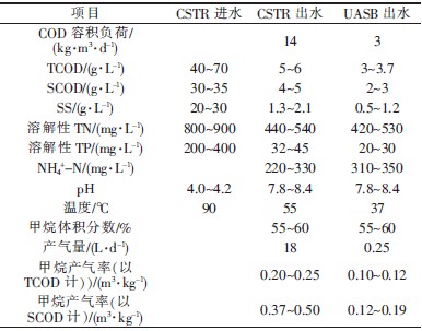 在高溫(55 ℃)條件下進行CSTR 的快速啟動。CSTR 采用低負荷啟動,經過80 d 左右的穩定運行,COD 容積負荷達到了14 kg/(m3·d)。在37 ℃的中溫條件下進行UASB 的低負荷啟動,經過30 d 左右UASB 運行穩定,運行期間進水COD 容積負荷一直穩定在3 kg/(m3·d)左右。啟動及運行過程中,沒有對兩級厭氧系統的pH 進行人為調節和控制。兩級厭氧反應器穩定運行后的實驗結果見表2。