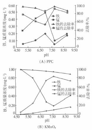 因此,在原水pH為7.14~7.72的范圍內使用PPC及KMnO4預氧化強化混凝均能取得較好的鐵、錳去除效果。