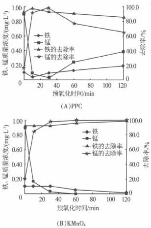 1.3.2預氧化時間對除鐵、錳效果的影響
