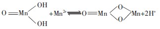的E0較高,氧化能力較強,與PPC類似,它能氧化有機物保護膜,使被包裹的二價鐵、錳裸露出來后與溶解態的二價鐵、錳一起被氧化,并最終以難溶鐵或錳的氧化物及氫氧化物形式析出。但酸性條件下KMnO4的還原產物為Mn2+,這使得出水中錳的含量較高,從而導致錳的去除率低但鐵的去除率卻接近100%。中性及堿性條件下,KMnO4的氧化能力較弱,但在中性環境中KMnO4的還原產物為難溶性MnO2,它以MnO(OH)2膠體的形式析出,而在弱堿性環境下,MnO(OH)2能通過離子置換去除Mn2+: