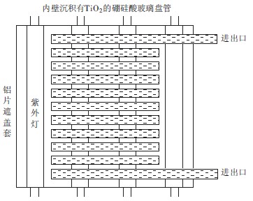 光催化反應器是反應能否高效進行的一個重要環節。根據TiO2的狀態不同反應器一般分懸浮態的光催化反應器和負載型光催化反應器2種。張峰等設計了適用于懸浮態TiO2 的光催化反應器,該體系采用內置光源環狀光反應器,離心風機鼓風冷卻防止高壓汞燈滅弧;反應器內環以石英材料制成,其余部分為有機玻璃;以離心泵抽動反應液連續受光照射,摒棄常用由下至上外加曝氣的循環方式,創新性采用由上至下經布水裝置淋漓至內環管壁的循環方式,增大了反應液與空氣接觸面積,增加了反應液停留時間,經實踐證明效果很好。Vorontsov 等[9]設計了負載式盤管光催化反應器,見圖1。