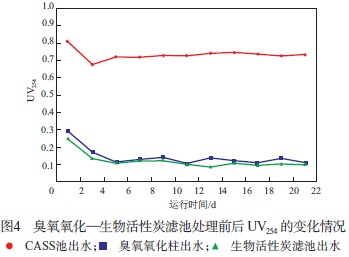 臭氧氧化—生物活性炭濾池處理前后 UV254的變化情況見圖 4。由圖 4 可見:CASS 池的出水UV254 較高,為 0.68~0.80;經臭氧氧化后臭氧氧化柱出水 UV254 下降到 0.11~0.29,臭氧氧化柱的平均UV254 去除率達 80.6%;再經生物活性炭濾池降解后出水 UV254 降至 0.09~0.24,平均為 0.12,生物活性炭濾池的平均 UV254 去除率為 16.0%;系統平均總 UV254 去除率達 83.7%。由此可見,UV254 主要通過臭氧氧化去除,生物活性炭對 UV254 的去除效果明顯。Wang 等[13]的研究同樣表明臭氧氧化對UV254 的去除占主導作用。UV254 通常用以表征具有芳香環結構或共軛雙鍵結構的有機物[14],而臭氧能夠與有機物中的 C C 和 C O 反應,破壞苯環結構或使有機物的芳香性降低甚至消失,由此導致 UV254 的降低[15]。