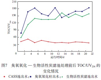 由圖 7 可見:CASS 池出水的 TOC/UV254 為35.9~52.4,具有一定的可生化性;經臭氧氧化后TOC/UV254 升至 79.0~184.3,平均提高 290%。表明臭氧氧化有效提高了廢水的可生化性[14],臭氧將一些難降解有機物氧化為可生化溶解性有機碳,有利于后續生物活性炭的有效去除[18]。經生物活性炭濾池降解后出水 TOC/UV254 為 59.6~162.7,比臭氧氧化后的 TOC/UV254 略有下降。