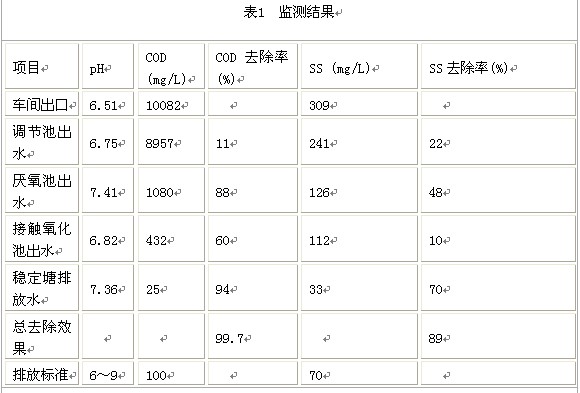 監測分析結果表明該治理工程的COD去除率為99.7%,其主要污染物在厭氧池中得以降解,厭氧池出水1080 mg/L,正好符合接觸氧化池的進水要求,COD太高則好氧生化困難,可見厭氧池參數設計是合理的。好氧接觸氧化池的COD去除率為60%,出水濃度432 mg/L,符合氧化塘的進水要求。氧化塘對COD的去除率為94%,出水僅25 mg/L,運行效果也是令人滿意的。