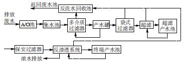通過對進水水質情況分析,在原有生化基礎上增加了A/O 系統,皮革廢水的深度處理采用多介質過濾+超濾+反滲透膜深度處理的組合工藝,其中多介質過濾去除生化工藝中殘留的比重比較大的固體污染物,超濾工藝進一步去除水中的小分子膠體等物質,保障后端反滲透工藝穩定運行,反滲透則作為深度處理的重要手段,使出水達到回用要求。廢水深度處理工藝流程如圖1 所示。