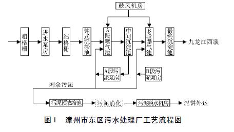 漳州市東區污水處理廠一期工程建成于1999年,設計處理能力為10萬m3/d,采用標準AB(Adsorption Biodegradation,生物吸附降解)工藝。該工藝是一種新型的兩段法生物處理工藝,A、B兩段串聯運行。該工藝技術上的突破主要在A段,A段前省去了初沉池,使城市管網中菌群和A段曝氣池污泥成為一個開放式生物系統,并在A段內部建立起獨立的污泥回流系統,而B段則是普通好氧活性污泥法[1-2]。