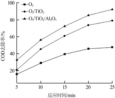 在pH為 9.4,溫度為20 ℃,臭氧質量濃度為80 mg/L,反應時間為25 min的條件下,考察了O3、O3/TiO2和O3/TiO2/Al2O3(其中,TiO2和TiO2/Al2O3投加量均為3.75 g/L)3種工藝對鉆井廢水COD的降解效果,結果如圖 2所示。