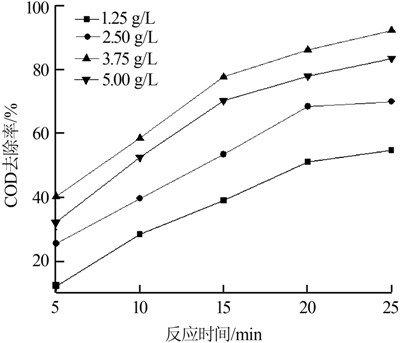 由圖 3可知,反應25 min時,隨著催化劑投加量從1.25 mg/L增至3.75 mg/L,COD去除率逐漸增大,分別為54.95%、70.09%、92.35%。這是因為隨著催化劑投加量的增加,體系中催化活性位點增多,改變了臭氧在水中的存在狀態,促使臭氧分解,進而提高了體系中·OH的生成量,促進了廢水中有機污染物的降解。但當催化劑投加量從3.75 mg/L增至5.00 mg/L時,COD去除率僅為83.54%,COD去除率出現下降。其原因可能是催化劑投加量增加促進了大量 ·OH的產生,但過多的·OH會導致其相互之間產生淬滅效應,進而大大減少了·OH與有機污染物的反應幾率,使COD去除率下降。綜合考慮處理成本與降解效果,選擇3.75 mg/L為最佳催化劑投加量。