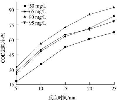 由圖 6可知,隨著體系反應時間的延長,COD去除率快速升高,當反應時間為25 min時,COD去除率可達到92.35%,繼續延長反應時間,COD去除率的變化趨于平緩。綜合考慮處理成本和降解效果,選擇25 min為最佳反應時間。