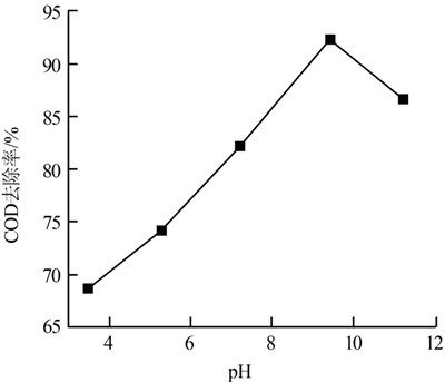 有研究表明,對整個多相催化臭氧化分解過程影響最大的是溶液的pH,因為氧化過程中最關鍵的2步——臭氧在溶液中的有效分解和催化劑的表面反應,都取決于溶液的pH。在溫度為20 ℃,TiO2/Al2O3投加量為3.75 g/L,臭氧質量濃度為80 mg/L,反應時間為25 min的條件下,考察了溶液pH對COD去除率的影響,結果如圖 5所示。