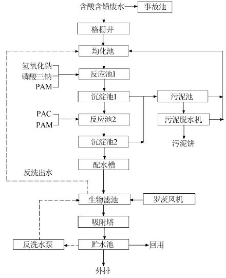 (1)廢水部分:生產(chǎn)廢水從車間內(nèi)各清水槽排出后進(jìn)入均化池,池內(nèi)設(shè)空氣攪拌,以儲存廢水并使之均質(zhì)均量。均化池出水經(jīng)提升泵泵入反應(yīng)池1,由pH自動(dòng)控制儀控制NaOH投加,控制廢水的pH范圍為10.0±0.5,后投加Na3PO4,進(jìn)一步沉淀廢水中的Pb重金屬離子,反應(yīng)后入沉淀池1進(jìn)行固液分離。經(jīng)固液分離后的廢水入反應(yīng)池2加PAC和PAM絮凝劑進(jìn)一步沉淀,后進(jìn)入沉淀池2再一次固液分離。從沉淀池2中出來的廢水入生物濾池、吸附塔及貯水池后達(dá)標(biāo)排放。