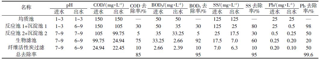 為使該廢水達(dá)標(biāo)排放,該企業(yè)確定建設(shè)一套污水處理裝置。設(shè)計(jì)出水水質(zhì)pH為6.0~9.0,SS為70 mg/L,COD為100 mg/L,Pb為1.0 mg/L,要求出水達(dá)到《污水綜合排放標(biāo)準(zhǔn)》(GB 8978—1996)中一級標(biāo)準(zhǔn)。