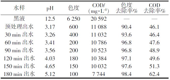 取900 mL黑液于塑料燒杯中,加鹽酸調(diào)節(jié)pH至3,將陰陽(yáng)極板分別用銅線連接至直流穩(wěn)壓穩(wěn)流電源,并用鐵架臺(tái)以間距5 cm固定在黑液中,通以 15 V的恒定電壓。在電解1 h后做預(yù)處理,即加入200 mg/L的聚合氯化鋁和3 mg/L的聚丙烯酰胺于磁力攪拌器上進(jìn)行混凝沉淀,靜置30 min后將上清液倒出繼續(xù)電解3 h,每30 min取上清液分別測(cè)定一次COD以及色度。試驗(yàn)結(jié)果如表 1所示。