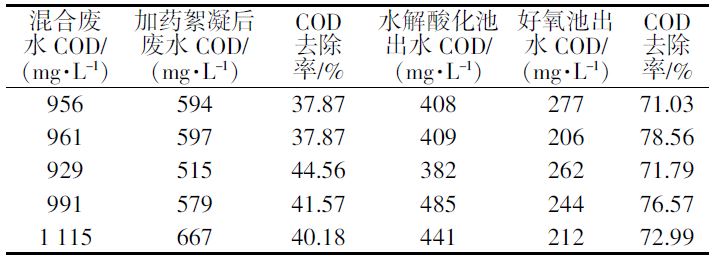 由表 3可見(jiàn),三種廢水的混合液在整個(gè)系統(tǒng)處理過(guò)程中,混合廢水經(jīng)加藥絮凝后COD去除率達(dá)37%~45%,COD最終去除率達(dá)到70%以上。好氧池出水COD 均在300 mg/L以下,滿足二級(jí)排放標(biāo)準(zhǔn)。