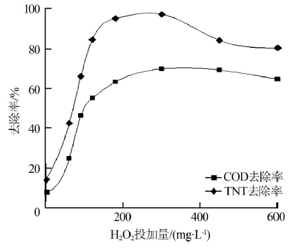 在Na2SO4 770 mg/L,電壓7 V,pH=7.0,電解時(shí)間2 h,極板間距7 cm的條件下,考察不同H2O2投加量對(duì)COD和TNT去除效果的影響,結(jié)果如圖 2所示。