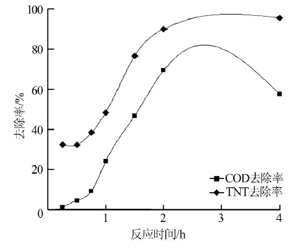 由圖 4可見(jiàn),0~2 h時(shí),TNT與COD的去除率隨反應(yīng)時(shí)間增長(zhǎng)而加大,并且在2 h時(shí)達(dá)到最大。當(dāng)反應(yīng)時(shí)間大于2 h時(shí),TNT去除率已無(wú)變化,而COD去除率卻有所下降,這主要是由于Fenton反應(yīng)已完全停止,H2O2完全消耗。此時(shí),由于長(zhǎng)時(shí)間的電解將少量苯環(huán)打開(kāi),造成COD增大,COD去除率下降。所以,最佳電解時(shí)間為2 h。具體參見(jiàn)http://m.xhxdt.com更多相關(guān)技術(shù)文檔。