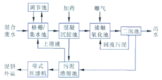 采用“物化/生物接觸氧化”工藝,設(shè)計規(guī)模為7.4×104 m3 /d,其中一期工程規(guī)模為1×104 m3 /d,二期工程規(guī)模為3×104 m3 /d,三期工程規(guī)模為3.4×104 m3 /d。總投資約為5 000 萬元。