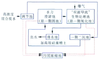 高濃度混合廢水進(jìn)入調(diào)節(jié)池調(diào)節(jié)水質(zhì)水量,沉淀大部分顆粒懸浮物后排入二沉池,進(jìn)一步強(qiáng)化調(diào)節(jié)池的處理效果,穩(wěn)定后續(xù)工藝的進(jìn)水水質(zhì)、水量,減輕負(fù)荷。出水后加高效硅藻精土處理劑與原水混合進(jìn)入水力澄清池,去除有機(jī)膠體微粒、纖維等懸浮物,然后進(jìn)入一期接觸氧化池(改為“雙面導(dǎo)流”生物處理池) 經(jīng)生物降解后排放。