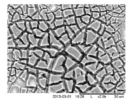 圖1為Ti/TiO2-SnO2-RuO2電極表面活性層的形貌。由圖1可以看出,電極表面有較多微小裂痕,這是鈦片表面的涂刷液在高溫下熱分解而形成的。電極表面活性層中微小裂痕的存在使該電極的真實表面積遠大于電極的表觀面積,增加了電極活性吸附點的數量,增強了電極對有機物的吸附能力,這種結構有利于電催化氧化反應的進行。