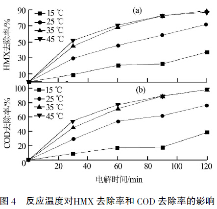 從圖4可以看出,不同反應溫度下,電極對HMX和COD的去除率隨著時間的增加而增大,且反應溫度對HMX去除率的影響十分明顯,隨溫度的升高,HMX去除率和COD去除率也顯著提高。當反應溫度達到35或45 ℃、電催化降解90 min時,HMX去除率和COD去除率的升高趨勢變緩。這是由于反應溫度升高,電流效率增加,降解反應速率加快;但當溫度達到一定值時,繼續升溫對HMX和COD的去除效果影響并不顯著。反應溫度設置為35 ℃時,對HMX炸藥廢水的處理效果最好,HMX去除率達到89.73%,COD去除率達到98.25%,因此確定反應最佳溫度為35 ℃。