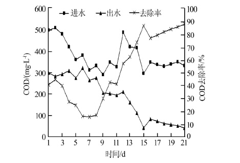 有機(jī)物降解速率主要受氧濃度與生物動(dòng)力學(xué)氧化速率控制。生物接觸氧化處理廢水的關(guān)鍵在于是否有足夠數(shù)量的生物膜附著在填料上,是否存在大量的藻類和原后生動(dòng)物,是否有一定量的絲狀菌能固定膜上生物等。因此掛膜快慢和掛膜質(zhì)量好壞是決定生物接觸氧化池啟動(dòng)成敗的重要影響因素。本工程投入污泥3 d后填料上即生成極薄的生物膜,進(jìn)行顯微鏡觀察發(fā)現(xiàn)有個(gè)別的豆形蟲,隨著營(yíng)養(yǎng)的不斷補(bǔ)充,生物膜不斷增厚,鏡檢原生動(dòng)物的種類也大大增加,草履蟲、鐘蟲等先后出現(xiàn),進(jìn)入第8天后鐘蟲數(shù)量減少,盾纖蟲、吸管蟲、輪蟲等原生動(dòng)物出現(xiàn),菌膠團(tuán)發(fā)育良好,出水COD降至200 mg/L。啟動(dòng)過(guò)程中接觸氧化池進(jìn)出水COD和去除率的變化情況如圖 3所示。