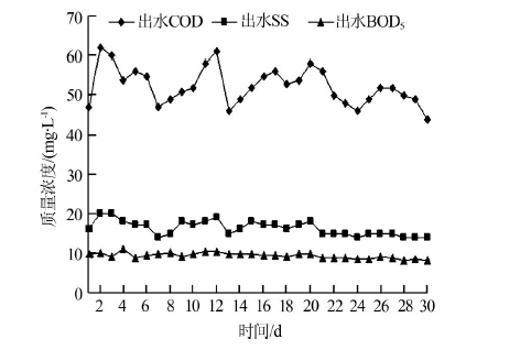 該處理系統(tǒng)經(jīng)過(guò)3個(gè)多月的運(yùn)行后,設(shè)備運(yùn)轉(zhuǎn)正常,整個(gè)系統(tǒng)一直處于穩(wěn)定狀態(tài),當(dāng)進(jìn)水COD在 1 560~2 490 mg/L,BOD5在620~880 mg/L,SS在150~200 mg/L時(shí),出水COD<62 mg/L,BOD5<20 mg/L,SS<11 mg/L,出水水質(zhì)可達(dá)到設(shè)計(jì)要求。2012年6月該系統(tǒng)出水COD、BOD5、SS變化情況見圖 4。