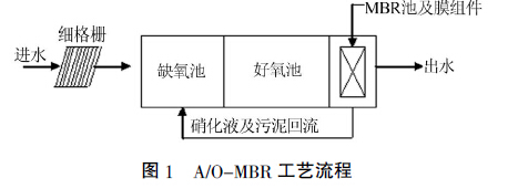 A/O-MBR工藝是將前置反硝化脫氮工藝與膜分離技術結合的具有高效脫氮除碳功能的組合工藝。一方面,膜生物反應器可截留世代周期較長的硝化細菌,使硝化細菌在反應器中富集,硝化進程較為完全;另一方面,硝化產生的硝態氮可通過前置反硝化轉變成氮氣,使高氨氮廢水中的氨氮得到很好的去除,提高出水的總氮去除率。張爽等應用A/O-MBR工藝處理高濃度氨氮廢水時,出水COD、氨氮及TN的平均去除率分別達到96.17%、97.76%、76.29%。