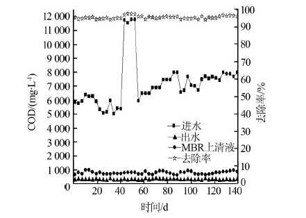 在反應器運行的140 d中,對MBR上清液及出水的COD進行連續監測。圖 2為A/O-MBR工藝對COD的去除效果。反應器進水COD在5.0×103~8.0×103 mg/L波動,平均進水COD為6 693 mg/L。盡管進水COD呈現波動趨勢,但出水COD穩定在較低水平。組合工藝出水的平均COD為277 mg/L,平均COD去除率達到95.68%。HRT和SRT的調整對COD去除效果影響不大,這表明MBR內較高的污泥濃度增強了反應器抗沖擊負荷的能力。Xiang Zheng等采用A/O-MBR工藝處理染色廢水,COD和BOD5去除率分別達到92.4%、98.4%。