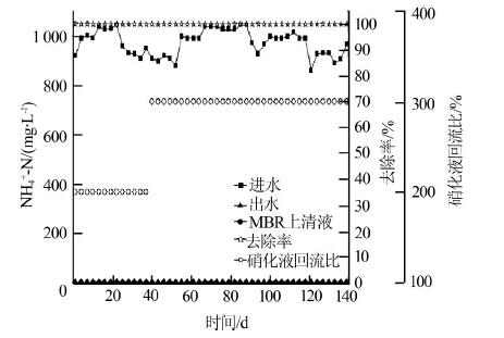 A/O-MBR對NH4+-N的去除效果如圖 3所示。由圖 3可知,A/O-MBR在140 d的運行中獲得了較好的硝化效果。系統進水NH4+-N在800~1 100 mg/L之間波動,系統出水NH4+-N的平均質量濃度為2.16 mg/L,平均去除率為99.78%。在HRT不斷減小的情況下,對NH4+-N的去除效果未產生影響?梢姡さ母咝Ы亓糇饔檬狗磻鲀雀患舜罅肯趸毦,相對于傳統的活性污泥工藝,顯著增強了系統的硝化效果。將回流比由200%提高至300%,也未對硝化效果產生明顯影響。同時膜的截留作用對NH4+-N的去除作用微乎其微,平均貢獻率為0.03%。張爽等運用A/O-MBR處理高濃度氨氮廢水,當硝化液回流比為2,碳氮比為6時,對NH4+-N的平均去除率高達97.76%,同時膜截留作用對NH4+-N去除的平均貢獻率為0.9%。這與本試驗的結果較一致。