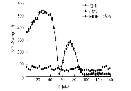 在反應的前25 d,出水的NO3--N不斷上升,第25天時出水NO3--N高達542 mg/L。投加甲醇作為碳源之后,出水的NO3--N在富碳源情況下被迅速消耗。在第58~88天進行了最佳碳源(甲醇)投加量的探索性試驗。在投加少量碳源的情況下,可以看到第58~73天NO3--N依然出現緩慢的積累。增加碳源投加量后,出水硝態氮下降。向廢水中投加1 500 mg/L甲醇時,反應器中基本沒有NO3--N積累。在反應器運行后期,出水NO3--N穩定在20 mg/L左右。Jinyou Shen等運用A/O-MBR工藝處理高濃度硝酸鹽(3 600 mg/L)廢水,當控制反應器的pH在7.5~8.5、碳氮比為1.56、HRT為30 h時,硝酸鹽氮去除率為99.9%,并且反應器中無亞硝態氮的積累,這個結果與筆者投加碳源情況下獲得的結果較一致。
