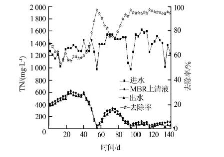 由圖 5可知,進水TN在1 027~1 527 mg/L之間波動,出水TN則在25~576 mg/L之間波動,去除率為54.14%~97.46%,平均去除率為78.88%,其中膜截留作用對TN去除的平均貢獻率為2.47%。潘懿等應用A/O-MBR處理城市污水,MBR段污泥質量濃度為18~21 g/L、HRT為4.4~4.8 h、回流比為300%時,TN去除率達到76.1%,這兩篇文獻報道的去除率與試驗得出的TN平均去除率比較接近。