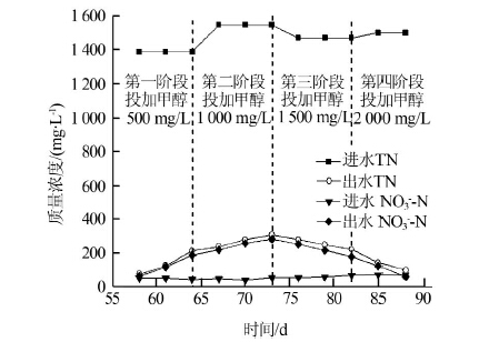 一般污水中的BOD5/TN>3~5即認為碳源充足,無需外加碳源。在試驗的第58~88天,將硝化液回流比設置為300%,考察進水投加不同量的甲醇(體積分數>99%)作為碳源對系統脫氮效果的影響,投加量分別為500、1 000、1 500、2 000 mg/L(以甲醇所占的COD計)。 圖 6為不同甲醇投加量下,進、出水TN及NO3--N的變化趨勢。