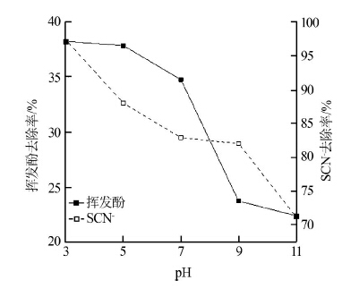 酸性條件下?lián)]發(fā)酚和SCN-的去除率比堿性條件下的好,這是因為在酸性溶液中發(fā)生以下反應(yīng):