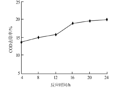 (1)反應時間對微電解過程的影響。稱取4 g預處理后的廢鐵屑、0.3 g活性炭放入100 mL廢液中,分別反應4、8、12、16、20、24 h,考察反應時間對COD去除率的影響,結(jié)果見圖 1。