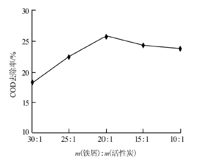 由圖 3可見,當鐵炭質(zhì)量比為20∶1時,COD去除率最高達25%以上,因此最佳鐵炭質(zhì)量比為20∶1。