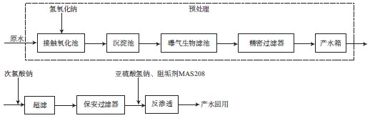 預處理—超濾—反滲透廢水深度處理工藝流程見圖1。原水首先進入接觸氧化池,加入氫氧化鈉調節pH,去除部分COD、NH3-N和SS;經過沉淀池沉淀后,再進入曝氣生物濾池,進一步生化降解水中的污染物,達到去除NH3-N和大部分COD的目的;上述工藝簡稱為預處理。出水經精密過濾器后再經次氯酸鈉殺菌,進入超濾裝置去除大分子有機物、膠體、細菌等;超濾出水經保安過濾器,加入還原劑亞硫酸氫鈉和阻垢劑MAS208后進入反滲透裝置,去除水中的大部分離子,產水直接回用。試驗采用連續運行方式。