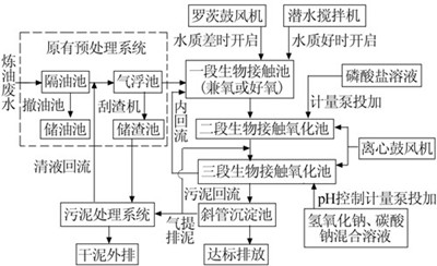 首先將煉油廢水進(jìn)行隔油、氣浮等物化預(yù)處理,去除廢水中含有的全部浮油、大部分乳化油及其他固體懸浮物,盡可能減小后續(xù)生化處理系統(tǒng)污染物負(fù)荷。