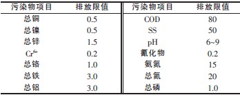 設計出水水質以《電鍍污染物排放標準》(發布稿)(GB 21900—2008)規定的表2 的排放標準為依據,具體指標如表1 所示。