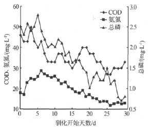 馴化階段MBR 出水的COD、氨氮、總磷變化情況如圖3 所示。