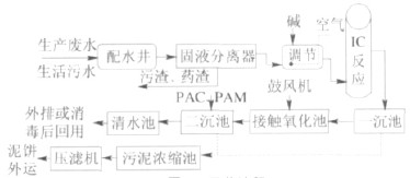 車間排放的生產(chǎn)廢水和經(jīng)化糞池處理后的辦公生活污水首先通過企業(yè)污水管網(wǎng)進入配水井進行充分混合,然后由泵泵入固液分離器,藥渣收集后回收利用,過濾后的廢水進入調(diào)節(jié)池后在調(diào)節(jié)池進行pH調(diào)整,此時pH 在4.0~5.0 之間,加入氫氧化鈉調(diào)節(jié)pH 至6.5~7.5 之間,調(diào)整pH 后廢水通過提升泵泵入IC 反應(yīng)器進行高級厭氧反應(yīng),在IC 中利用厭氧菌的生物降解作用, 有效去除大部分COD,IC 反應(yīng)器出水自流入一沉池,經(jīng)過一次沉淀后自流入進入兩級生物接觸氧化池,生物接觸氧化池出水自流入二沉池,在二沉池中心進水管處投加聚合氯化鋁(PAC)、聚丙烯酰胺(PAM)進行混凝沉淀,經(jīng)厭氧、好氧、混凝沉淀處理后的廢水進入清水池,出水達(dá)到污水綜合排放標(biāo)準(zhǔn)(GB 8978-1996)中的一級標(biāo)準(zhǔn),可外排也可增加動力消毒后進行回用。而一沉池、二沉池、底部污泥提升入污泥濃縮池后再進行帶式壓濾機脫水,脫水后污泥外運或者制作磚塊利用。