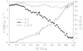 IC 反應(yīng)器的啟動主要是接種污泥的馴化,本工程IC 反應(yīng)器接種污泥取自南昌市某污水處理廠的消化污泥,投加量為2 t,經(jīng)過90 d 的啟動運行,池內(nèi)污泥質(zhì)量濃度達(dá)到15 g /L。圖2 是IC 在90 d 運行期間對COD 的去除效果,可以看出,當(dāng)反應(yīng)器進水pH 控制在6.5~7.5 時,隨著馴化的進行,IC 反應(yīng)器對COD 的去除率逐漸上升,從開始的1.15%提高到第87 天的86.66%。至此IC 反應(yīng)器進入了穩(wěn)定的運行狀態(tài)。從第70 天開始,每隔一天取IC 反應(yīng)器中的污泥發(fā)現(xiàn),污泥從接種時的散狀變?yōu)轭w粒狀,顏色變?yōu)楹谏,而且產(chǎn)氣量逐漸趨于穩(wěn)定,此時IC 反應(yīng)器對COD 有較穩(wěn)定的去除效率。