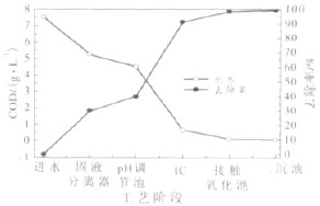 IC 反應(yīng)器作為目前COD 容積負(fù)荷最高的厭氧反應(yīng)器,反應(yīng)器內(nèi)厭氧顆粒污泥種類多,濃度高,使得IC 反應(yīng)體系具有很強的穩(wěn)定性和適應(yīng)性,污水中的COD 經(jīng)厭氧處理,轉(zhuǎn)化為沼氣,基于氣體提升原理,在反應(yīng)器內(nèi)形成內(nèi)部循環(huán)流,促進COD 的進一步降解,確保后續(xù)生物接觸氧化處理系統(tǒng)能正常運轉(zhuǎn)。
