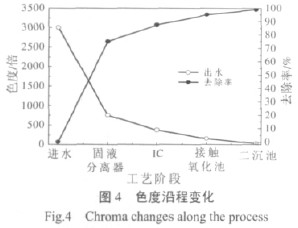 組合工藝穩(wěn)定運行期間色度沿程變化如圖4 所示。由圖4 可以看出,廢水經(jīng)固液分離器后固液分離,色度得到較好的去除效果,去除率可達(dá)75%,隨后在IC 反應(yīng)器中的作用下,色度可以得到部分去除且累積去除率為87.5%, 在生物接觸氧化池色度累積去除率為95%,在二沉池混凝劑絮凝沉淀作用下,色度最終去除率可達(dá)到99%,出水色度濃度維持在30 倍以下。