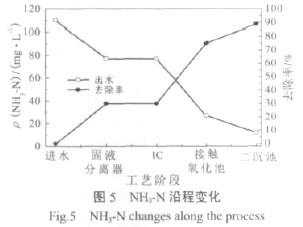 組合工藝穩(wěn)定運行期間氨氮沿程變化如圖5 所示。由圖5 可以看出,廢水經(jīng)固液分離器后氨氮去除率約30%,在pH 調(diào)節(jié)池、IC 反應(yīng)器中氨氮沒有得到去除,在生物接觸氧化池硝化細(xì)菌、反硝化細(xì)菌的作用下,廢水中大部分氨氮得到去除且累積去除率為75%,在二沉池混凝劑絮凝沉淀作用下,氨氮最終去除率可達(dá)到89%,出水氨氮質(zhì)量濃度維持在15mg/L 以下。