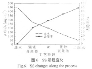 組合工藝穩(wěn)定運行期間SS 沿程變化如圖6 所示。由圖6 可以看出,廢水經(jīng)固液分離器后SS 得到有效去除,去除率約40%,在IC 反應(yīng)器中SS 累積去除率為57%,在接觸氧化池SS 累積去除率為73%,在二沉池混凝劑絮凝沉淀作用下,SS 最終去除率可達(dá)到88%,出水氨氮質(zhì)量濃度維持在60mg/L 以下。
