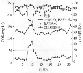 該工程調試內容主要是一體化O3-BAF 系統和BAF 系統中微生物的培養及馴化。首先分別向一體化O3-BAF 系統和BAF 系統中投加干污泥,然后加入生活污水,并投加適量的面粉和營養物質,控制m(COD)∶m(N)∶m(P)在100∶5∶1 左右。連續悶曝3 d后注入二級生化池廢水,開始每天以1 m3/h 的流量進水,出水COD 去除率一直穩定在60%以上,掛膜培養成功。隨后逐步提高進水量至2.5 m3/h,使去除率穩定在60%以上,培養馴化成功。最后開啟臭氧系統,實現整個系統的完整連續運行。